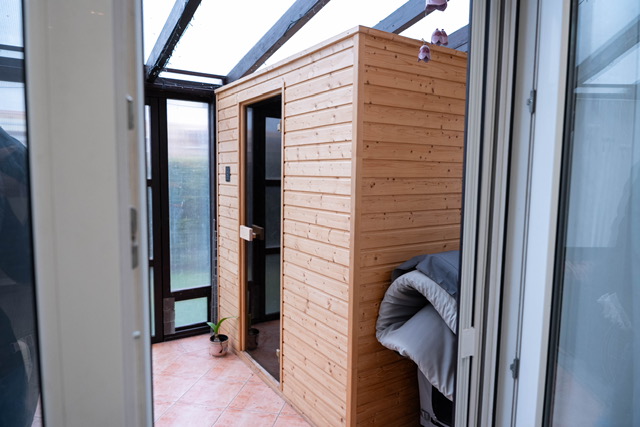 露台上設有四人桑拿房,兼具芬蘭桑拿爐和紅外線桑拿功能。