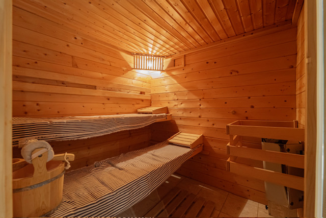 專屬健康區設有 6 人桑拿浴室、兩人按摩浴缸和帶鹽牆的休閒區,