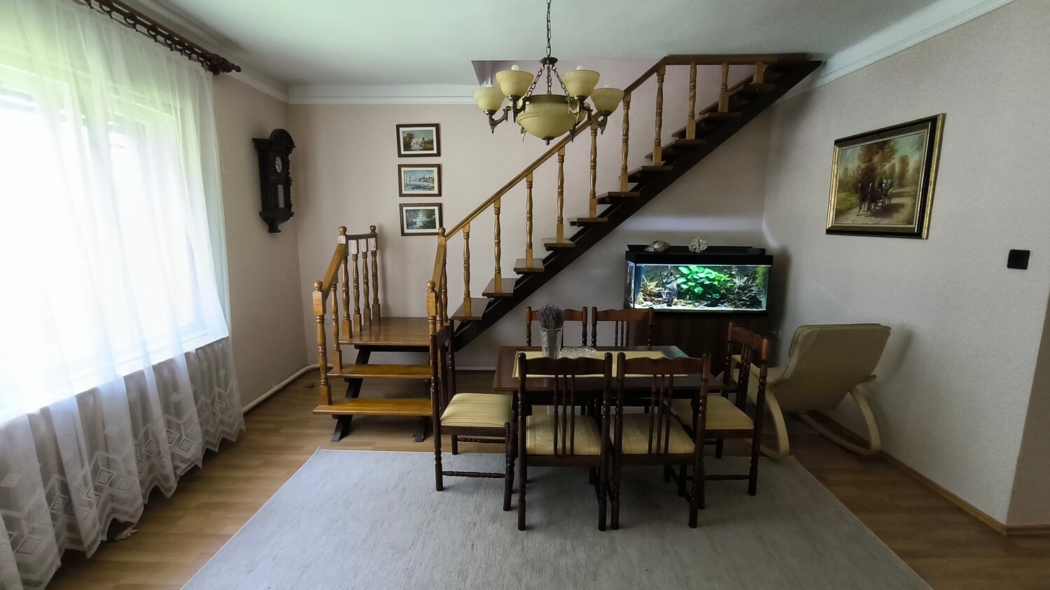房間佈置:門廳,對面是帶淋浴和衛生間的浴室,左側是帶餐廳的廚房。從這裡可以上樓,樓上分為兩部分:客廳和臥室。此外,房屋後方還有一個帶鎖的儲藏室(5平方公尺)。