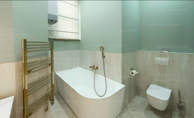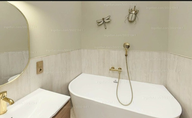 向左走,我們來到客廳,客廳通往一間浴室,浴室採用精美的瓷磚和金色配件,營造出溫馨舒適的氛圍。